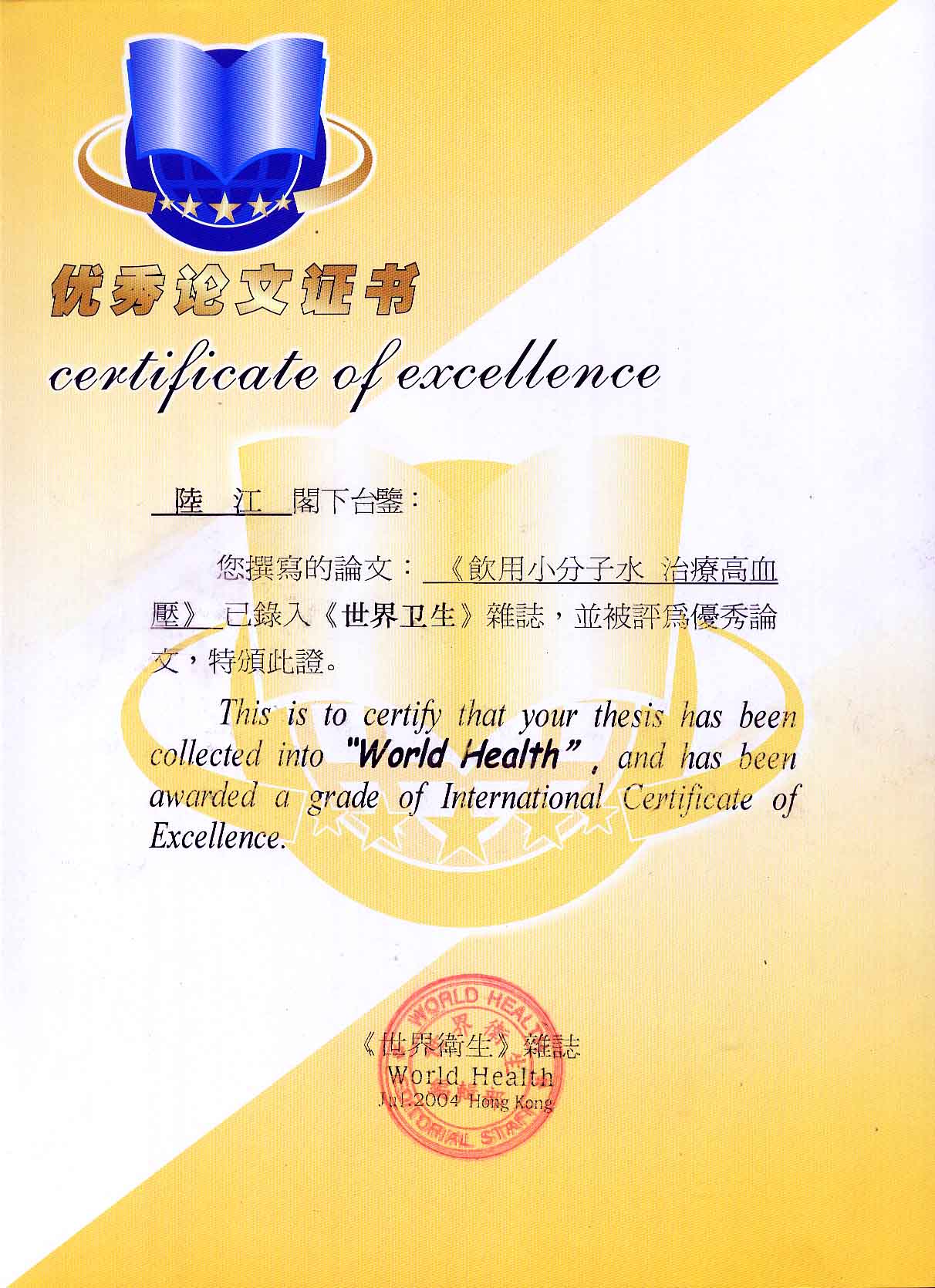 《飲用小分子水治療高血脂》獲優(yōu)秀論文獎