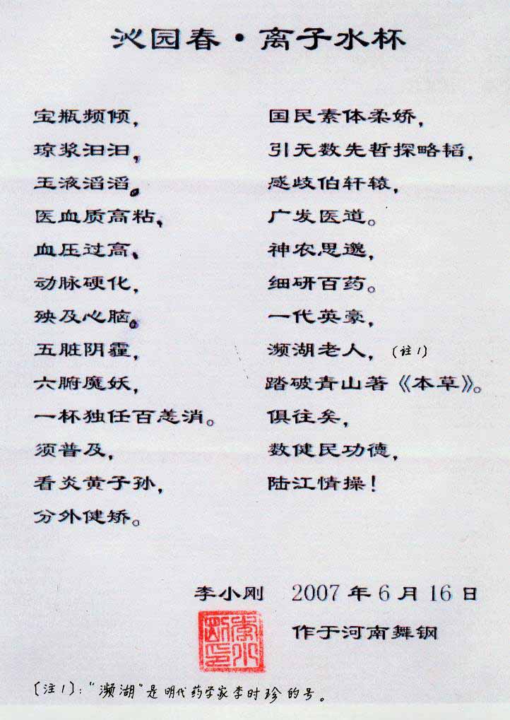 -----我是從事建筑的高工,本來沒有資格去攻克醫(yī)學(xué)難題,卻為了自身健康才扣響醫(yī)學(xué)的大門。由于我1990年患高血壓,因怕中風(fēng)才研究發(fā)明了離子水瓶,我把水處理成微小分子團水,飲用后治愈了高血壓。便于1993年底送到三家省級醫(yī)院做臨床試用4個月。經(jīng)北京和廣西醫(yī)學(xué)專家鑒定:"降脂降壓效果好"," 能擴大心腦動脈流量,改善心腦電圖以及微循環(huán)","對治療心腦動脈粥樣硬化、高血壓、高血脂有良好的醫(yī)療保健作用。""產(chǎn)品的技術(shù)性能和療效達到了同類產(chǎn)品的國內(nèi)領(lǐng)先水平,經(jīng)廣西醫(yī)學(xué)科學(xué)情報研究所檢索,未見國外有類似報道。"中國醫(yī)學(xué)科學(xué)院張正國教授從美國國立醫(yī)學(xué)圖書館數(shù)據(jù)庫存Medline檢索英俄文資料,均未見類似報告。2000年上市后,我為了對消費者負責(zé)而繼續(xù)觀察研究,一直通過《信譽卡》和《質(zhì)量跟蹤調(diào)查書》向患者承諾療效,請用戶使用6個月后反饋效果。和脂壓患者飲用2至5個月內(nèi),消除癥狀,停服藥物,血壓正常;冠心病患者飲用3~5個月逐漸減輕至消除心絞痛、房顫等癥狀,不再服藥,飲用1年左右心電圖正常,經(jīng)冠脈造影掃描無明顯狹窄,表明冠心病痊愈。大量患者還反映許多衰弱器官被修復(fù),讓前列腺增生、慢性咽喉炎、慢性氣管炎、支氣管炎、慢性胃炎、腸炎和膽囊炎等不藥而愈;2型糖尿病患者是因為胰島衰弱致病,飲用該水半年至一年,逐漸減藥至停藥,血糖尿糖正常,真正治愈2型糖尿病。中風(fēng)后遺癥患者飲用六七個月,可逐漸減輕至消除肢體和語言障礙,表明飲用該水能讓壽命很長的神經(jīng)元細胞逐漸修復(fù),奇跡般地恢復(fù)肢體和語言功能。飲用后還使胸腺和脾臟兩個重要的免疫器官被修復(fù)和增強,產(chǎn)生免疫細胞多,提高了免疫力,使人不生病或少生病。自此, 飲用微小分子團水創(chuàng)造了攻克冠心病、高(低)血壓和糖尿病三大醫(yī)學(xué)難題的奇跡。人們對此感到不可思議,但實踐是檢驗真理的唯一標(biāo)準(zhǔn)。